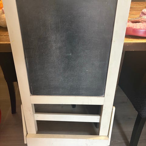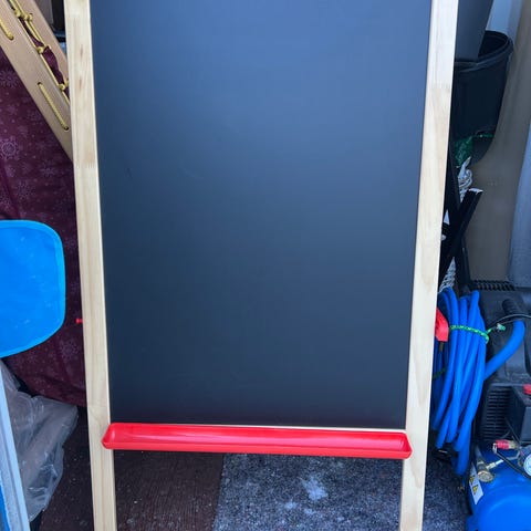 IKEA staffeli tavle for barn med to sider. Den ene siden har svart tavleflate til kritt, den andre siden har hvit flate egnet for tusj eller papir. Staffeliet har ramme i tre og røde detaljer, inkludert brett nederst til oppbevaring av kritt, tusjer eller annet tegneutstyr. Egnet for innendørs bruk til tegning, skriving og lek for barn.