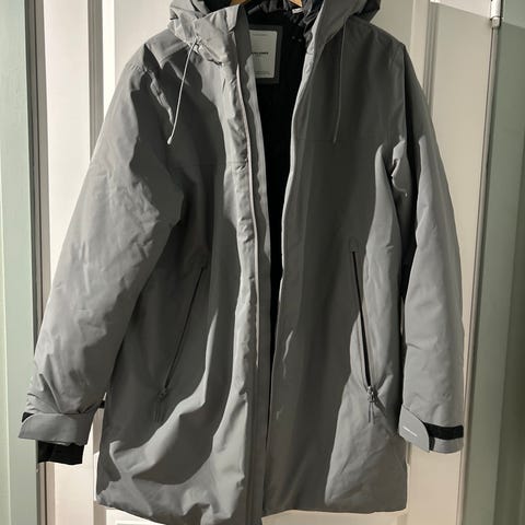 Jakken er grå og laget i polyester. Den har hette og glidelås med knappestolpe foran. Innvendig er den vattert for ekstra isolasjon, med Thermore-fyll som gir jevn varme. Ytterstoffet er glatt, mens innsiden har mykere materiale i øvre del for økt komfort.