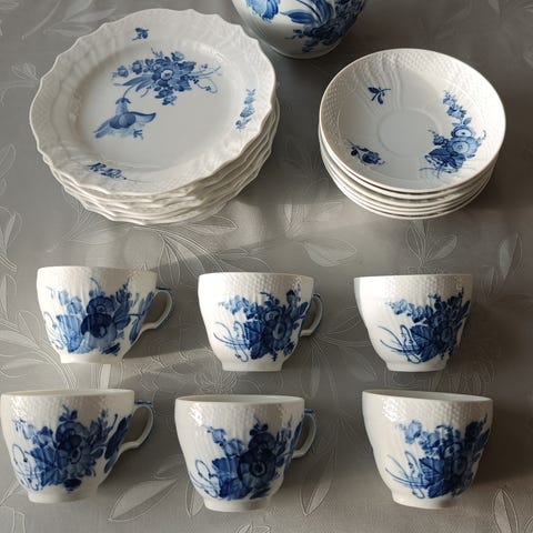 - 5 små kopper (diameter 7,5) med 8 stk underfat/kaffeskål. Pris: 200 kroner.