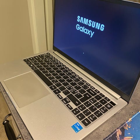 Samsung bærbar PC i sølvfarge. Modellen har slankt design med stor skjerm og fullstørrelse tastatur med numerisk del. Den har stor styreflate under tastaturet. På sidene finnes flere tilkoblingsmuligheter, blant annet USB-A, USB-C, HDMI, hodetelefonutgang og minnekortplass. Egnet til generell bruk som kontorarbeid, studier og nettbruk.