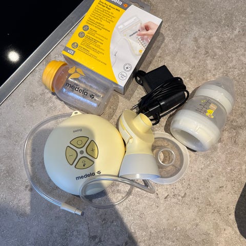 Medela elektrisk brystpumpe med tilhørende flaske og diverse tilbehør. Settet inkluderer pumpeenhet med strømledning, slange, brysttrakt og flaske som kan brukes til oppsamling av morsmelk. Egnet for pumping av morsmelk hjemme. Utformet for bruk av voksne som ammer og ønsker å pumpe og oppbevare melk på en praktisk måte.