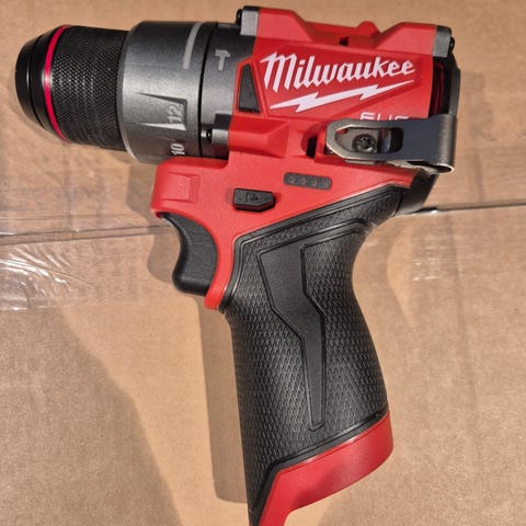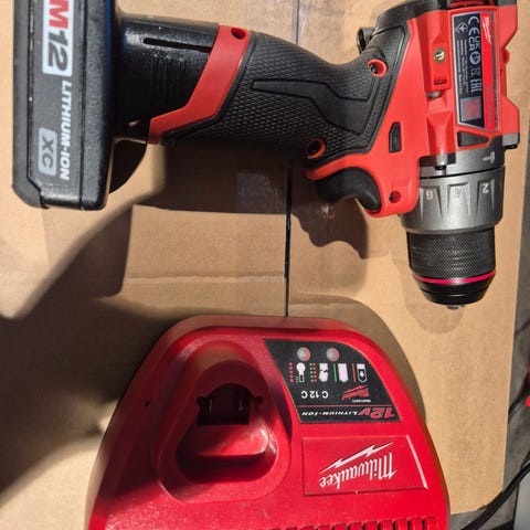 Milwaukee M12 drill med batteri og lader. Litt usikker på kapasiteten til batteri, men jeg tror den er 3ah.