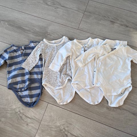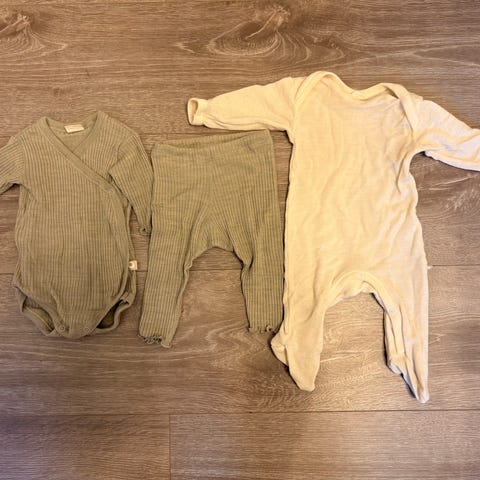 Ull body og jumpsuit str 56. To stk Joha og en Fix. En flekk og lite hull i den hvite ull-bodyen fra Joha.