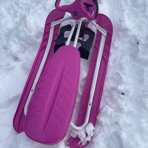 rattkjelke i rosa plast med hvit ramme og sort detalj på rattet. Kjelken har rattstyring foran og brede meier på sidene for stabilitet på snø. Fotbrems foran. Egnet som vinterleke for barn. Kan brukes i bakker og på andre snødekte underlag