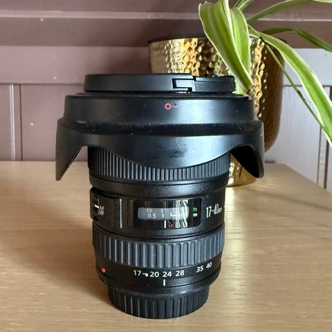 Canon EF 17-40mm f/4 L USM med Canon Solblender og Canon Linseveske for 2500kr. "Det er noen små riper på forsiden av linsen på plasten, men glasset er fritt for riper og fungerer som det skal"