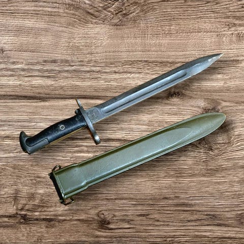 British Pattern 1907 (P07) bayonet for the British .303 Enfield SMLE (Short Magazine, Lee Enfield) No. I Mk III rifle. This pattern of bayonet was used in World War I and World War II and was the standard British small arms bayonet. This bayonet was made in England, Australia and India. As shown here, this P07 was made in England by Wilkinson in WWI and is fitted to the WWII British .303 SMLE rifle and the British Lanchester 9mm machine carbine (submachine gun) as used by the British Royal Navy. Blade length is 17 inches with an overall length of 21.75 inches. The leather scabbard has a metal tip and throat and a round frog stud that was adopted in 1915.