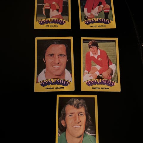 28 stk fotball kort, av Manchester United, fra 1970 tallet.