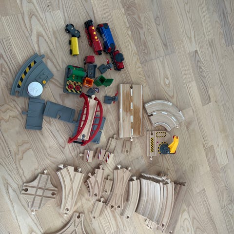 BRIO togbane trelekesett. Inneholder ulike deler til togbane i tre, som skinner, broer, bygninger og tilbehør. Delene kan kombineres til ulike baner og miljøer, og passer sammen med andre BRIO togbaneelementer i tre. Egnet som lekesett for barn som liker tog og konstruksjonslek.
