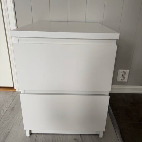 Selger malm kommode/nattbord. Har lagt kontaktplast på toppen av kommoden, denne tror jeg ikke går av. Kommoden har noen bruksmerker men funger som normalt. Må hentes