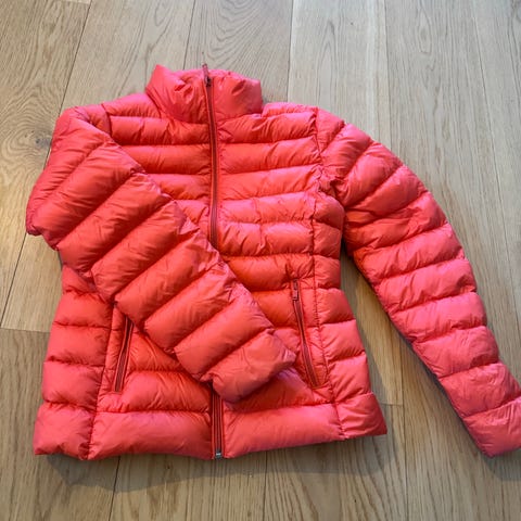 Vattert dunjakke (90% dun og 10% fjær). Lett og perfekt vårjakke. Pent brukt uten flekker eller rifter. Nydelig lys lilla farge i to nyanser.