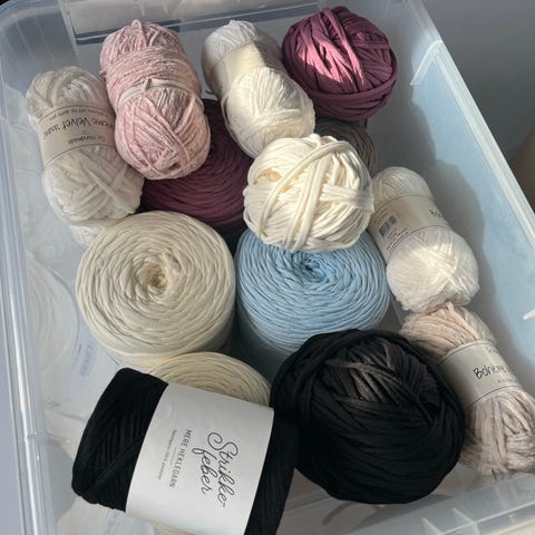 her er heklegarn I mye tynt forskjellige tykkelser og mengder antar ca 1.5 kg har ikke vekt mange mere er det i alle fall