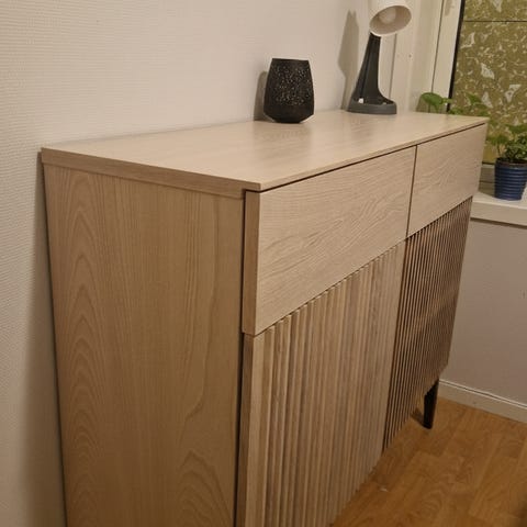 Selger en utrolig flott og moderne skjenk med et stilrent design. Sjalusidører (lameller) gir den et unikt og eksklusivt preg som passer perfekt inn i ethvert moderne hjem.