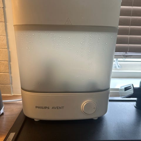 Philips Avent flaske- og tilbehørssterilisator i hvit plast. Elektrisk modell med strømledning og av/på-bryter i front. Består av base med varmeelement, beholder for vann, innsats med hull for plassering av flasker og tilbehør, samt lokk. Egnet for sterilisering av tåteflasker, smokker og annet babyutstyr. Enkel å ta fra hverandre for rengjøring. Det kan forekomme bruksspor på plastdelene, se bilder for detaljer.