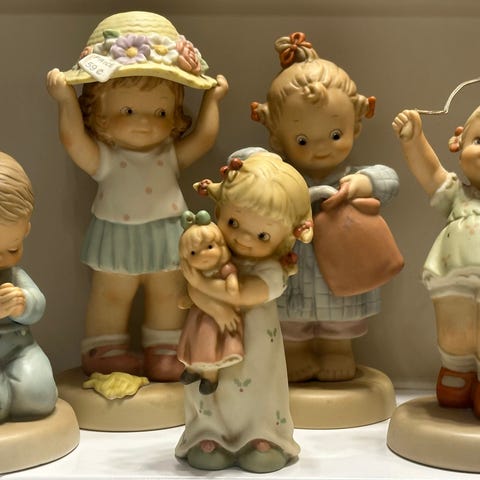 Samling med figuriner i porselen og keramikk med ulike motiver. Motivene inkluderer blant annet barn, kvinnefigurer og en figur ved benk. Figurene har ulike størrelser og farger, og står samlet på bordflate. Egner seg som pyntegjenstander i hylle, skap eller på bord, eller som tilskudd til en samling av dekorative figuriner.