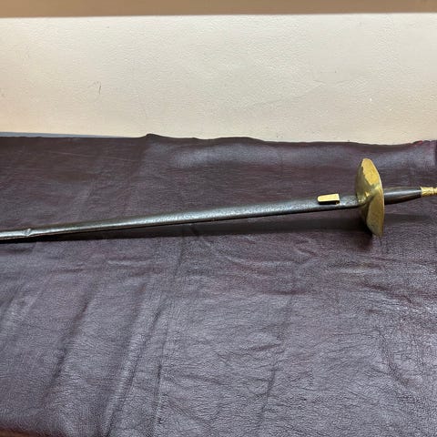 Dekorativ krumsabel med tilhørende slire. Klingen er buet og laget i metall, med gravert mønster på utsiden av sliren. Håndtaket er i mørkt tre med metallbeslag ved parerstykke og knapp. Egner seg som pyntegjenstand, rekvisitt eller samlerobjekt. Ingen synlig merke- eller modellbetegnelse.