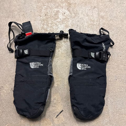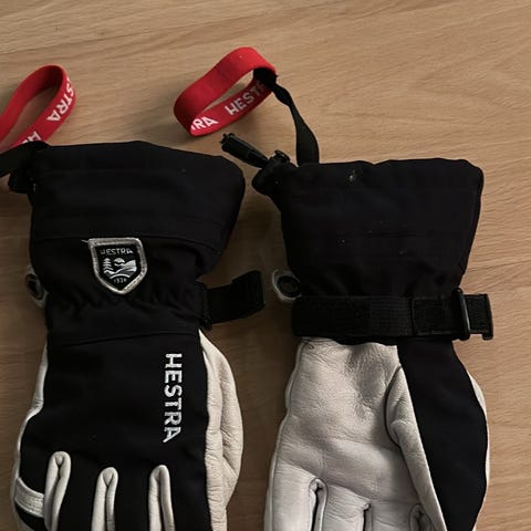 Vann- og vindtette votter, med inner vott, to lag. Går opp på underarmen, veldig tykk, varm og god. Leash til armen, så de ikke mistes npr man tar de av. Skinn på håndflaten.