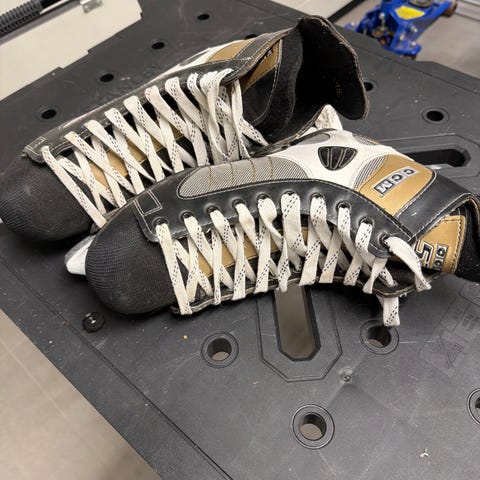 CCM 9350 ishockeyskøyter i størrelse 40,5 Skøytene er svarte med hvite lisser og hvit holder. Modellen er beregnet for ishockey og har stiv yttersko for støtte rundt ankel og fot. Bladene er montert i lett plast-holder. Passer til bruk på isbaner til trening og fritidsspill i ishockey.