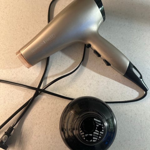 Remington One Dry & Style hårføner med flere innstillinger for varme og luftstyrke. Modellen har kompakt design med håndtak der betjeningsknappene er plassert på innsiden. Føneren leveres med ulike munnstykker, blant annet diffuser og konsentrator for mer presis luftstrøm. Det følger også med en oppbevaringspose. Kjøpt for ca to år siden.