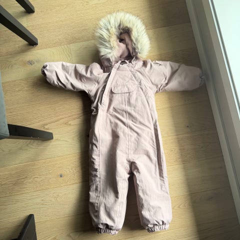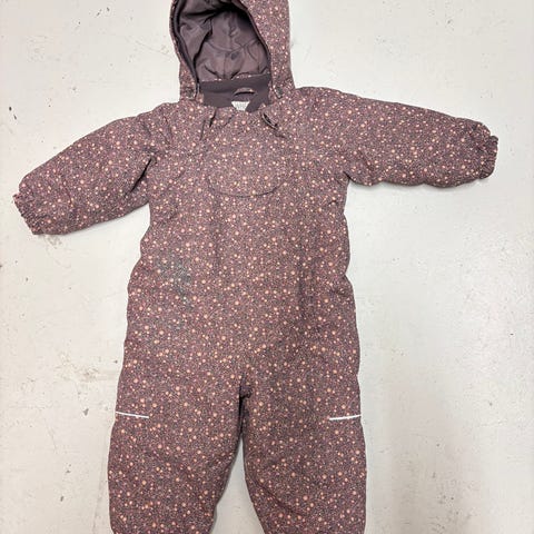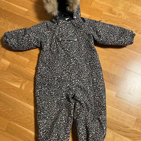 Fint brukt vinterdress til jente. Med blomster mønster i blå og rosa med hette. Hele fot strikker.