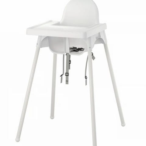 IKEA høy barnestol i hvit plast med grå metallben. Stolen har avtagbart brett som gjør det enkelt å plassere barnet og rengjøre etter bruk. Egnet som spisebordstol for små barn som trenger støtte og sikker sitteposisjon ved måltider. Benene kan tas av for enkel transport og oppbevaring.