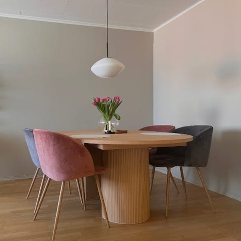 Hvis ønskelig kan 6 stk stoler (4 grå stoler og 2 rosa) fra Søstrene Grene som du ser på bilde, kjøpes for kr 2 000 (ny pris per stol: 1000 kr).