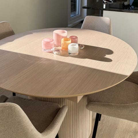 Spisebord Linea fra Fagmøbler 120 cm i diameter + 1 stk ileggsplate. Nytt i 2022. Et par bruksmerker på overflaten av bordet. Lys naturolje og eikefiner.