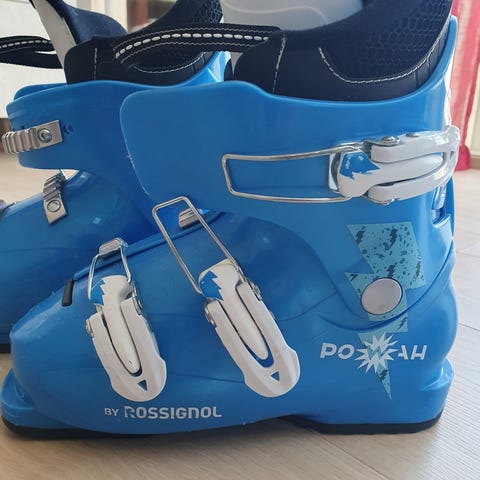 Rossignol Poesiah alpinstøvler for barn i størrelse 235 (275 mm sålelengde). Støvlene er blå med hvite spenner og svart innersko. Modellen har tre justerbare spenner for god tilpasning rundt fot og legg. Passer til vanlige alpinbindinger for barn og er egnet til bruk i alpinbakke og på skiskole.