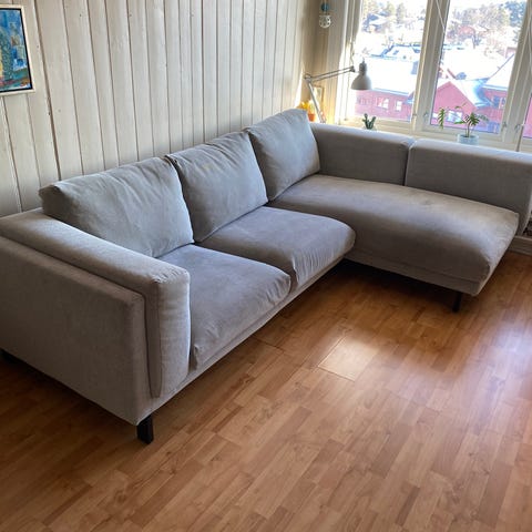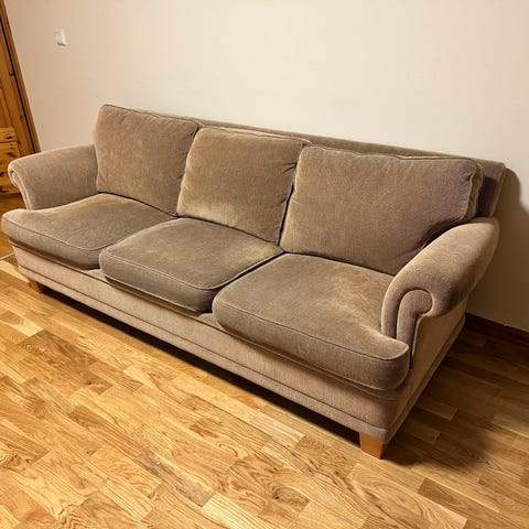Veldig godt brukt sofa! Den SER ganske "strøken" ut, men der jeg har laget et hjerte synker man meeekbart ned (mulig det kan fikses med å spikre noe opp under), samt ryggen er litt "deflata" (men fungerer godt om man slenger noen pynteputer el. I ryggen). Fungert bra som "ligge og råtne foran TV" her. Må hentes kjapt! -vi har bært den ut i carporten, der stå den i to deler og kan enkelt lempes over i en varebil/henger ☺️
