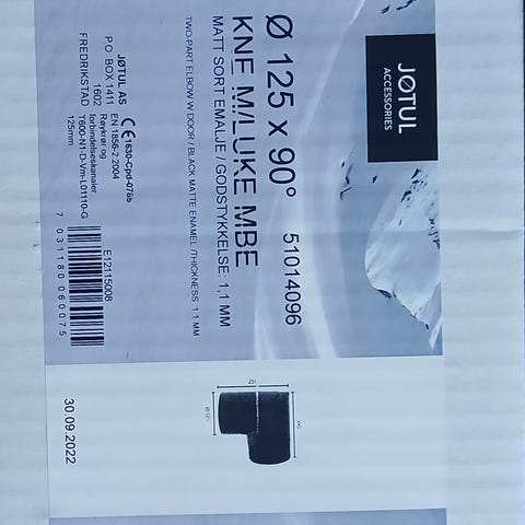 Jøtul 150 x 90° 3-delt røykrørsmuffe i grått stål. Vinkel 90 grader og diameter 150 mm. Egnet som del av røykrørssystem til vedovn eller peis der det er behov for vinkeltilpasning. Leveres som tredelt muffe for enklere montering og justering av røykrøret. Uåpnet/ny