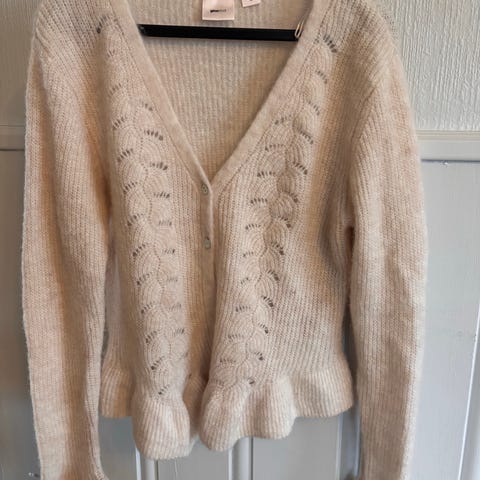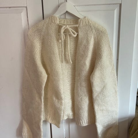 Selected Femme cardigan for dame i størrelse M. Modellen er i hvit farge og strikket i mohairullblanding, som gir et mykt og loddent uttrykk. Cardiganen har rund hals, knapper foran og knytebelte i livet. Ermene er lange, og det er struktur- og hullmønsterdetaljer på forstykket. Passer som varm og lett ytterdel eller som lag over topp eller kjole i hverdagen.