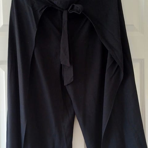 Ser ut som bukseskjørt på. Høyt liv, lommer i sidene.