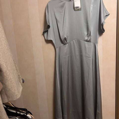 H&M hverdagskjole for dame i størrelse S. Kjolen er svart og laget av polyester. Modellen har lange ermer med mansjetter og knapp, samt knytebelte i livet. Stoffet er lett og silkeaktig, faller mykt. Passer som enkel hverdagskjole eller til mer pyntede anledninger avhengig av tilbehør. Sender også uten fix ferdig om ønskelig.