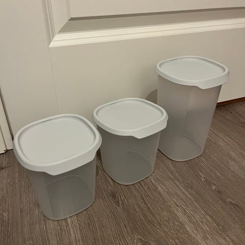 IKEA oppbevaringsbokser til kjøkken i gjennomsiktig plast med hvitt lokk.