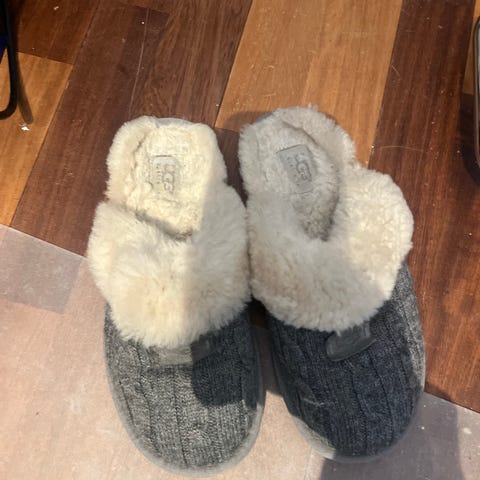 UGG slippers/ tøfler i størrelse 38. Modellen er en åpen hæltøffel med strikket beige overside og mykt, lyst saueskinnsfôr. Yttersåle i gummi for bruk innendørs. Passer som innetøfler på kalde gulv eller til generell bruk hjemme.