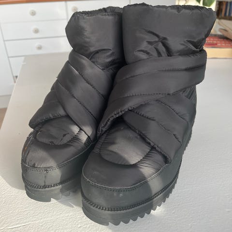 UGG vinterstøvler i størrelse 40. Støvlene er laget i brunt semsket skinn med lys, myk ullfôr på innsiden. Modellen har middels høy skaft som kan brettes ned for å vise fôret, og lukkes med knappedetalj på siden. Sålen er i gummi med mønster for bedre grep. Egnet som varme og isolerende vinterstøvler til hverdagsbruk i kaldt vær.