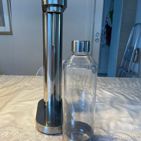 Stelton brusmaskin i rustfritt stål. Manuell kullsyremaskin for å lage kullsyrevann hjemme. Vertikal søylekonstruksjon med flaske som festes foran. Overdel med trykknapp for å tilføre kullsyre. Leveres med gjenbrukbar flaske i plast eller glass (avhengig av modell). Passer på kjøkkenbenk eller annen benkflate der det er behov for kullsyrevann til daglig bruk eller servering.