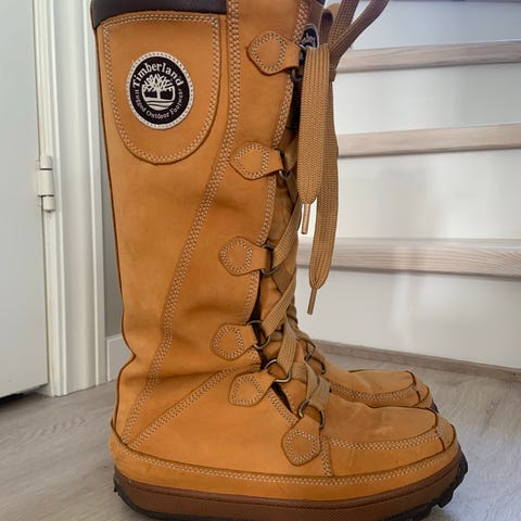 Timberland vinterstøvler i størrelse 37. Støvlene er laget med overlær i ekte skinn, syntetisk fôr og syntetisk yttersåle med grovt mønster. Farge brun med mørk polstret ankelkrage og snøring med metallhemper. Modellen er merket US 6.5 W på lappen innvendig. Egner seg som robuste vinterstøvler til hverdagsbruk og utendørsaktiviteter i kaldere vær.
