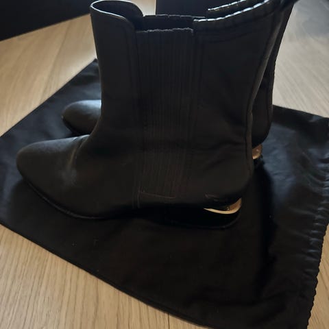 Alexander Wang støvler i størrelse 41. Støvlene er i svart farge med kraftig, blokkformet hæl og spiss tå. Modellen rekker over ankelen og har et rent, minimalistisk uttrykk. Egner seg til bruk til hverdags og mer formelle anledninger, og passer godt sammen med både bukser, skjørt og kjoler.
