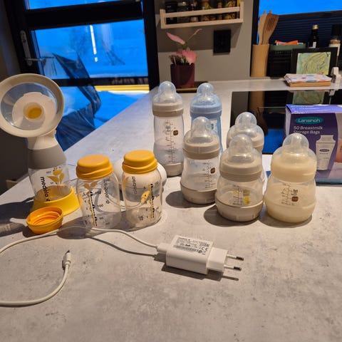 Settet inneholder en elektrisk pumpeenhet, brysttrakt med koblingsdeler, to Medela tåteflasker med 1 lokk, slange og strømledning med adapter. Pumpen lades via medfølgende strømadapter.