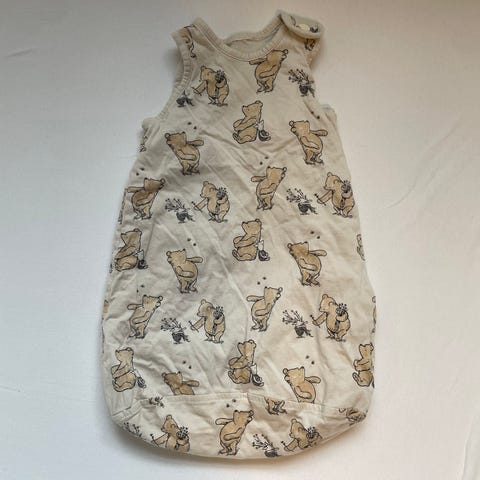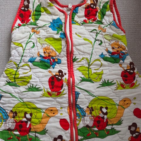 Myk nattpose med dinosaurer, 58–66cm (1–6 måneder). Bomull på utsiden med polyfyll (TOG 1.5). Amerikanske merke Burt's Bees Beekeeper Wearable Baby Blanket. Litt misfarging på overdelen, men ellers i veldig god stand.