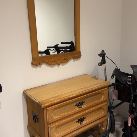 Kommode og speil i samme serie selges p.g.a fornyelse. Kommoden er synlig brukt men allikevel i god stand. Skuffene er stabile og intakte. Topplaten er "fornyet" med kontaktplast som kan evt. byttes ut for å få sin egen stil. Speilet er uten feil/mangler. Mål speil 73 x 103 cm