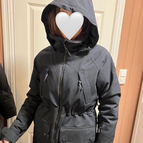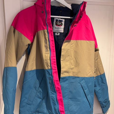 Burton ytterjakke/anorakk for dame i størrelse S. Passer str 38. Jakken er i polyester, er svart med hvitt mønster. Burton-logo på brystet, ved lomme og på hals glidelås. Modellen har hette, glidelås og knappelukking foran, samt lommer i sidene med glidelås. Glidelås i venstre side opp mot armhule for enklere av/påkledning.