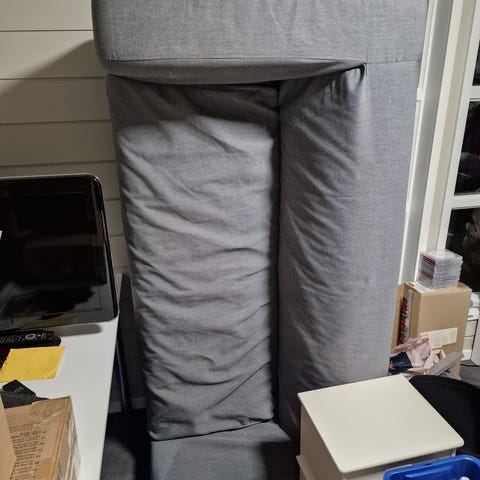 En enkel sofa. Selges fordi jeg flytter. Den står ute under tak, så det er veldig behagelig å sitte på balkongen om sommeren. Den har alltid vært dekket med et teppe, så den er ren inni.