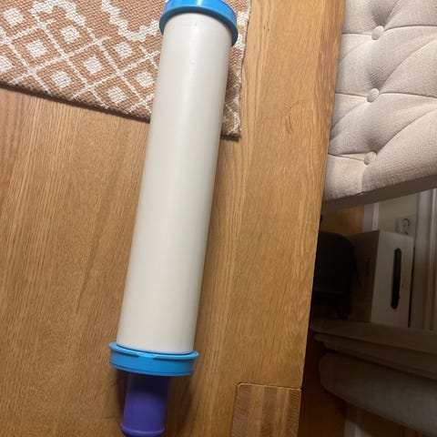 Tupperware kjevle i plast med hvit rullende del og lilla håndtak. Kjevlen er egnet til utbaking av deig til for eksempel kaker, kjeks og paier. Plastmaterialet gjør den lett å rengjøre og håndtere på kjøkkenbenken.