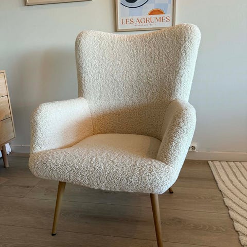 Fin og behagelig lenestol fra Jysk i off-white teddystoff.