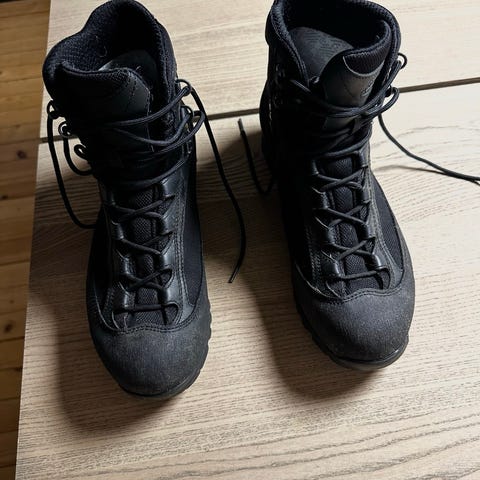 Svarte støvler i skinn med snøring foran og hempe bak på skaftet. Sålen har kraftig mønster for bedre grep. Støvlene har middels høyt skaft og polstret innside rundt ankelen for økt komfort. Passer som robuste hverdagssko eller til bruk ute i variert vær og terreng.