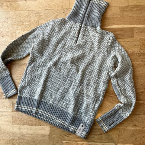 Lars monsen høyhalset ullgenser for dame i størrelse L. Genseren er beige med mønsterstrikk og har høy hals med glidelås i front. Ribbestrikkede mansjetter og nederkant gir en tettere passform. Laget i ull, egnet som varm genser til hverdagsbruk eller som mellomlag på kjølige dager.