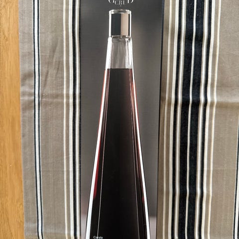 Rosendahl karaffel i klart glass. Karaffelen har en slank, konisk form med metallfarget topp. Egnet til servering av vann, saft eller andre kalde drikker ved borddekking på kjøkken eller spisestue. Kan også brukes som dekorativ glassflaske.