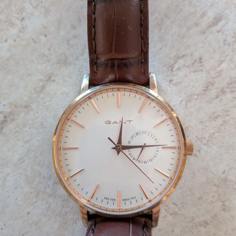 GANT unisex armbåndsur med rund grønn urskive og datovisning. Urkassen og lenken er i metall med klassisk leddet stållenke og foldespenne. Analoge visere og markeringer på timene. Passer både til hverdagsbruk og mer formelle anledninger for både kvinner og menn.