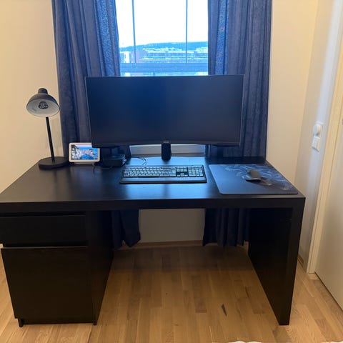 Sort Malm (IKEA) skrivebord til salgs for kr 1000. Skuff og underskap. Lengde: ca 140 vm. Dybde ca 65 cm. Høyde ca 73 cm. Lite brukt.